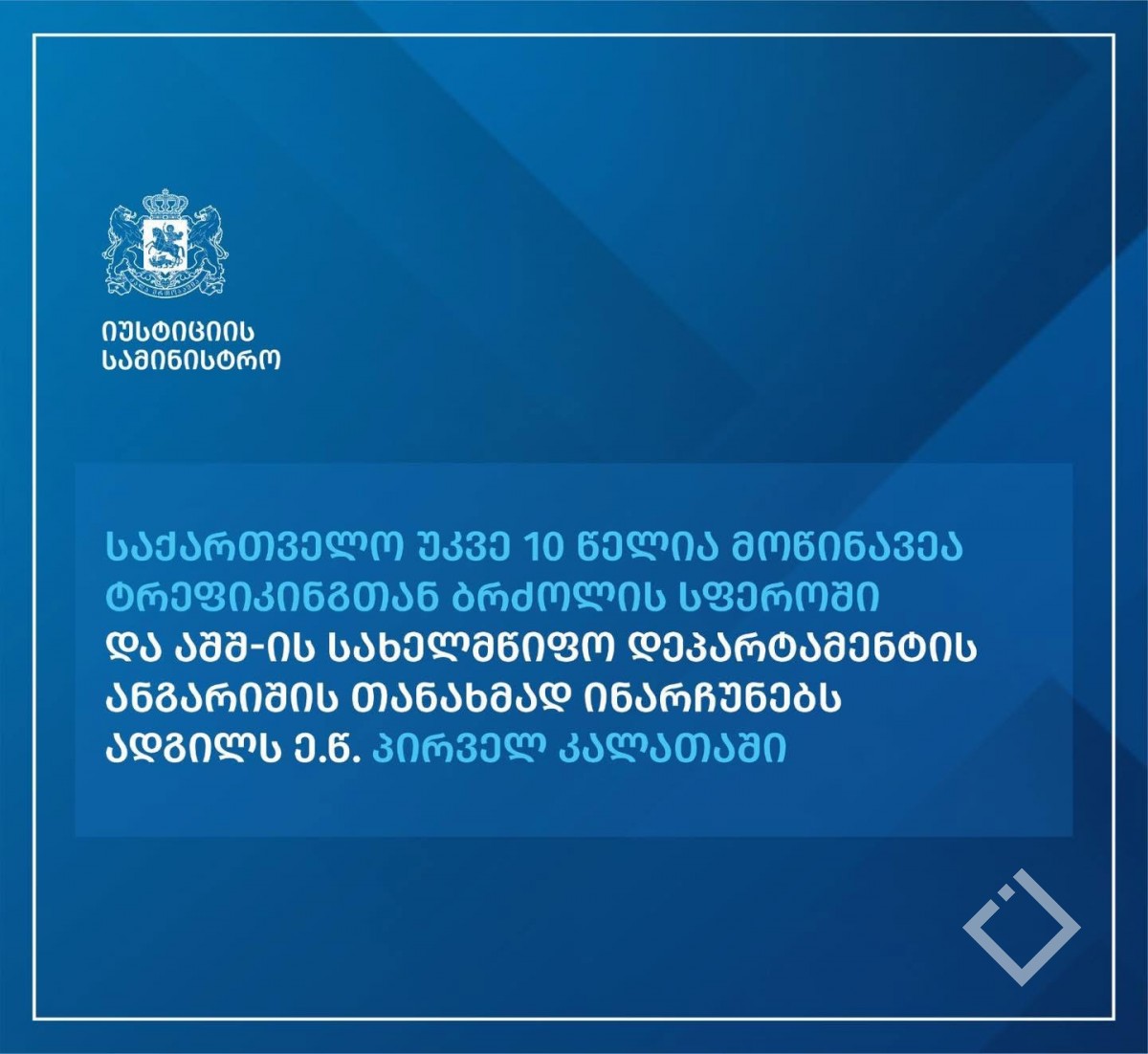 საქართველოს მიერ აშშ-ის სახელმწიფო დეპარტამენტის ანგარიშში მოწინავე პოზიციის დაკავება და საანგარიშო პერიოდში მიღწეული პროგრესი ადამიანით ვაჭრობის (ტრეფიკინგის) წინააღმდეგ მიმართული ღონისძიებების განმახორციელებელი საუწყებათაშორისო საკოორდინაციო საბჭოს ეფექტიანი მუშაობის შედეგია",- აცხადებენ სამინისტროში.